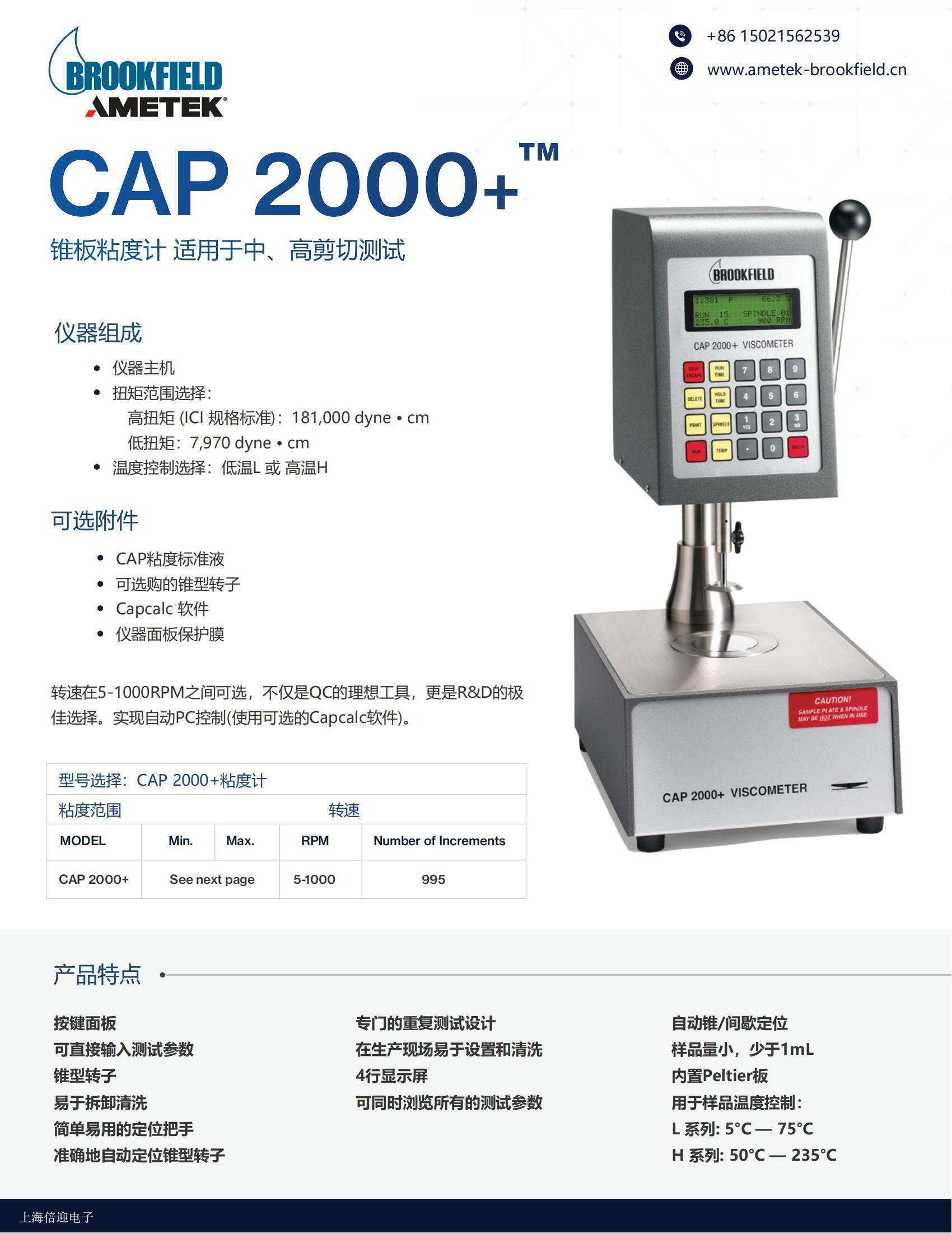 博勒飛CAP2000+錐板粘度計(jì)是一種緊湊、耐用型儀器,是在生產(chǎn)車(chē)間或質(zhì)量控制實(shí)驗(yàn)室進(jìn)行快速、簡(jiǎn)易、重復(fù)性測(cè)試的較好工具。樣品量小是一個(gè)有利因素,此外還有內(nèi)置于樣品盤(pán)中的集成式溫控。CAP2000+轉(zhuǎn)速在5-1000rpm之間可調(diào)節(jié),有10個(gè)錐轉(zhuǎn)子可選,適用于不用粘度范圍的樣品測(cè)量。